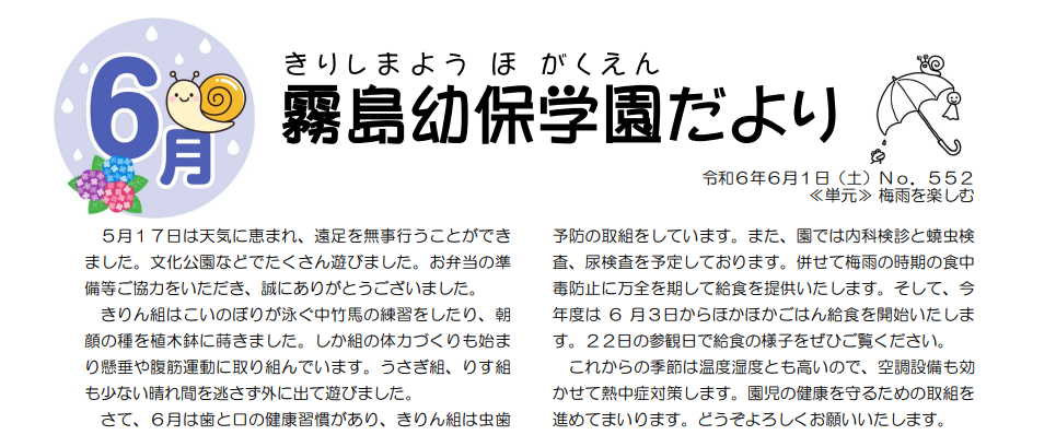 園だよりのページ(霧島幼保学園→園だより)に令和6年10月号を掲載しました。