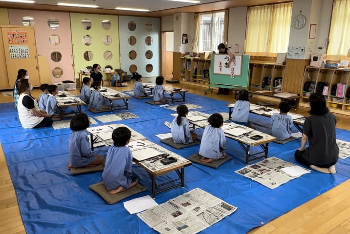 文化活動特別講師を招いて習字教室を開催(通常10月から)。毛筆文化にふれながら、集中力を養っていきます。就学前には、ひらがなや数にもふれて入学準備をします。